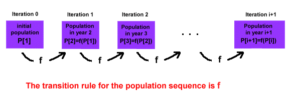 The same rule (i.e., f(x)) determines the new population level from the old population at each stage. Iterating this rule over and over will produce the entire population sequence.