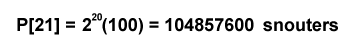A population of snouters starts out (in year 1) at 100, and they double in number every year. How many snouters will there be in 20 years?