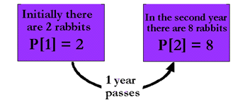 A reasonable answer might be 32, particularly if half of the 8 rabbits are male, the other half female. This is because 8 rabbits can be paired off into four pairs of rabbits. Each of these four pairs can then be expected to reproduce in the same way as the original pair did. (A rabbit is a rabbit is a rabbit...) Since 2 rabbits led to 8 rabbits in the first year, one might expect 4 pairs of rabbits to become 4(8) = 32 rabbits in the third year. Similarly, in the fourth year you might expect to have 4(32) = 128 rabbits. In general, if P[i] is the population of rabbits in year i then P[i+1] = 4P[i] is a reasonable way of predicting the population one year later (i.e., in year i + 1).