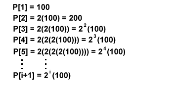 The previous sequence, P[i+1] = 2P[i], is said to grow exponentially. The reason for this should become clear if you think about the explicit description of the sequence.