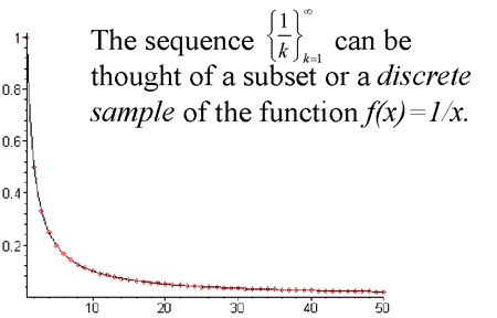 This sequence can also be visualized as a subset of the curve defined by the function f(x) = 1/x defined over all positive real numbers: