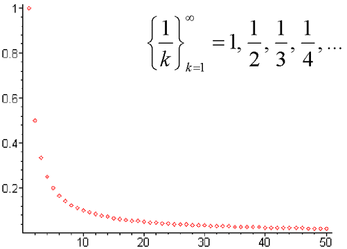 Visualizing sequences...The plot of a sequence, say {Pi}, is much like the plots of functions you have seen in the past (e.g., those commonly encountered in pre-calculus), but you won't get a smooth curve. The domain of a sequence is the set of positive integers. Hence the plot of a sequence {Pi} consists of bunch of "dots", with each dot placed over a positive integer i -- at a height determined by the value of Pi.