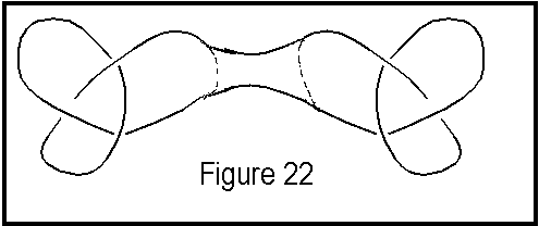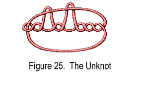 A rather interesting point Adams makes is that if the unknot happens to be composite, then every knot must be composite.  It may seem obvious at first thought that the unknot is not composite, but figure 25 shows an unknot that looks as if it could be composite.  If the unknot is composite, then it must be made up of two nontrivial knots.  That is, every knot which is the composition of itself with the unknot would really be a composition of two nontrivial knots, and hence be composite.  So every knot would be composite.  However, Adams proves that this is not true, just as the analogous situation in the integers is not true, where 1 is not a composite number. [1]