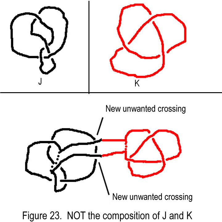 See figure 23 for an example of how NOT to compose two knots. The result if done correctly is called the composition of the two knots.  Adams denotes the composition as J#K. [1]