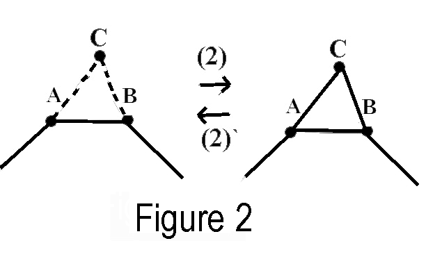 2` (converse of 2) If there exists in space a triangle ABC that contains two adjacent edges AC and CB of K, and this triangle does not intersect K, except ant the edges AC and CB, then we may delete the two edges AC, CB and add the edge AB. (see figure 2) [4]