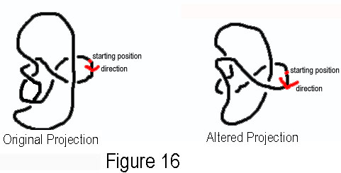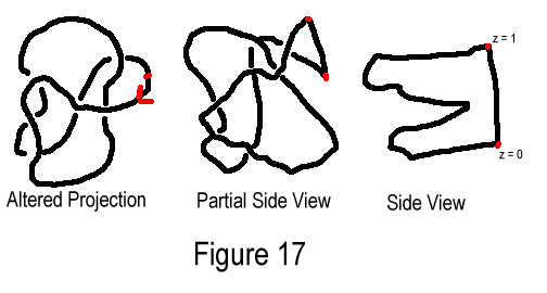 Applying an x-y-z-coordinate system to the knot in 3-space with the z-axis coming straight out towards us, assume that the initial point is at coordinate z = 1. Continuing to trace along the knot, at each crossing we will decrease the z-coordinate at that point, until the last point will have coordinate z = 0. But the last point is the same as the first point, so we must put a vertical bar from the last point to the first point to complete the knot. Now, as demonstrated more clearly in figure 17, as we examine the knot straight down the z-axis, the knot has no crossings. That is, the knot is the unknot. Thus, we have shown that any arbitrary knot has a finite unknotting number. [1]