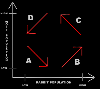 the predator population against the prey population. The predators looked at here will be the wolves (on the y-axis) and the preys will be rabbits (on the x-axis). The starting assumption is both the wolf and rabbit populations start low. Due to the rate that predators and prey reproduce, as shown in region A, the population of the rabbit increases and the population of the wolf decreases. Region B shows the population of the wolf growing as the rabbits' increase. Then in region C, since the wolf population increases, the rabbit's decreases. Finally, region D takes us back to the beginning, where the wolves decrease in number as the rabbits die off.